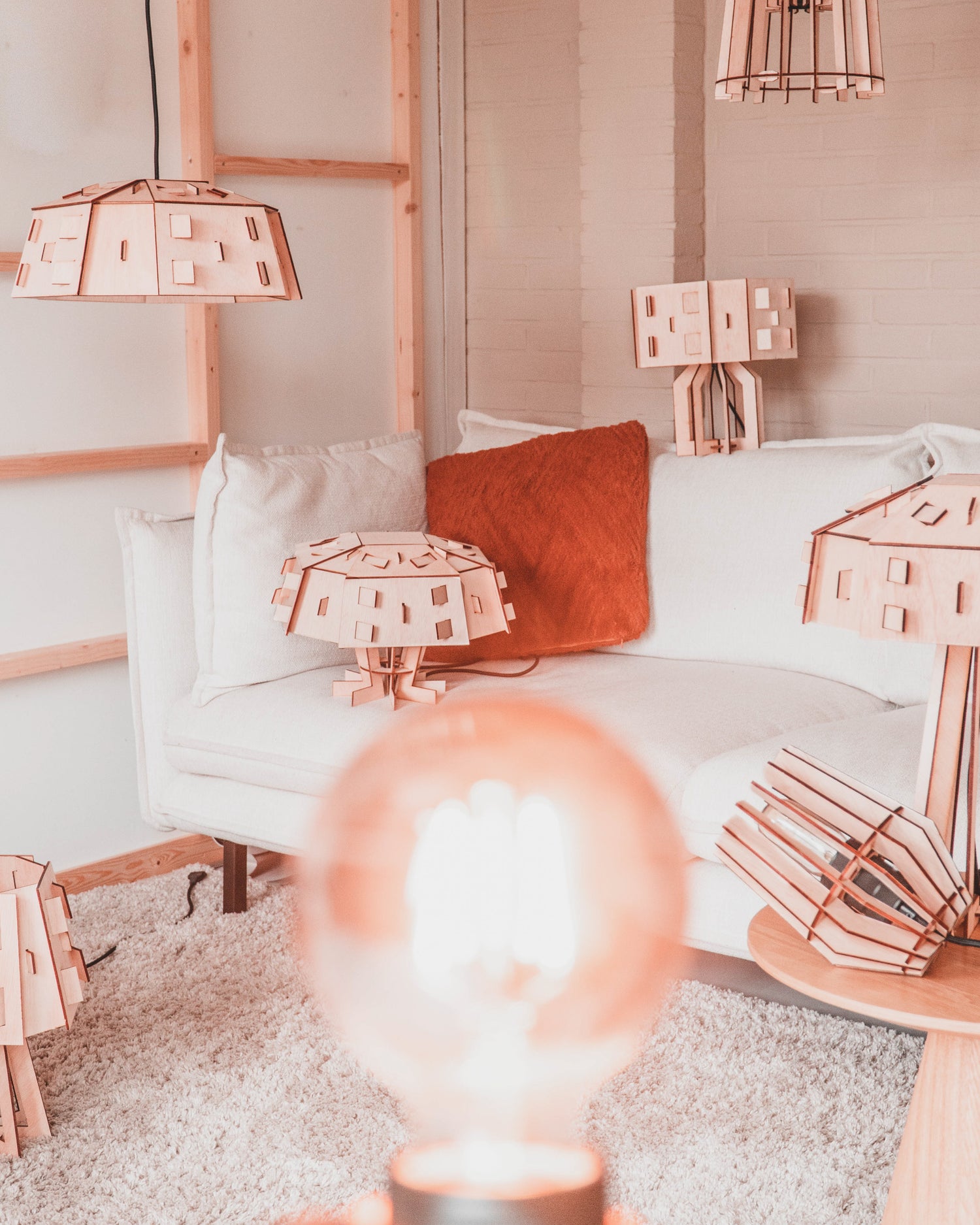 Womp is de houten lamp, een lasergesneden lamp die bestaat uit verschillende onderdelen. Hierdoor kun je zelf je lamp in elkaar zetten met behulp van een bouwpakket.